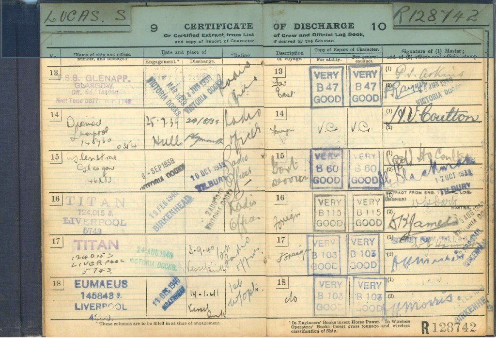 According to his service record, Grandad worked on 11 voyages during the six years of the war. This included serving on two ships, torpedoed, and sunk by enemy submarines.