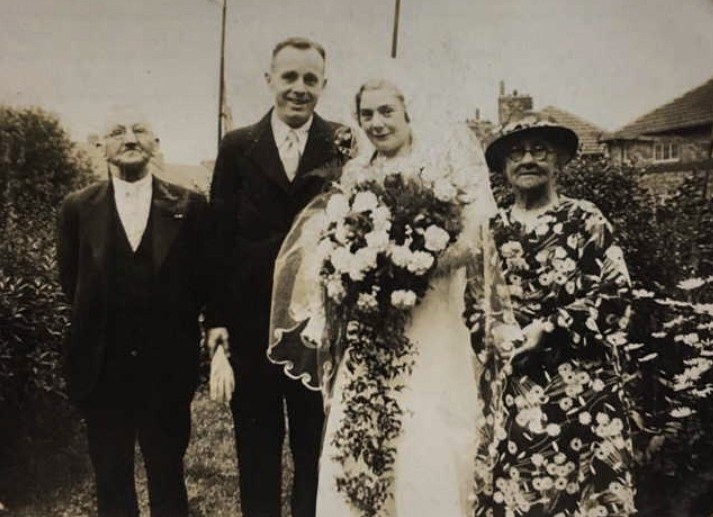 July 1938 wedding of Stanley Lucas (my grandad) and Frances Foster (my nana) with Albert Edward and Cecilia Foster (Nana’s grandparents), Liverpool